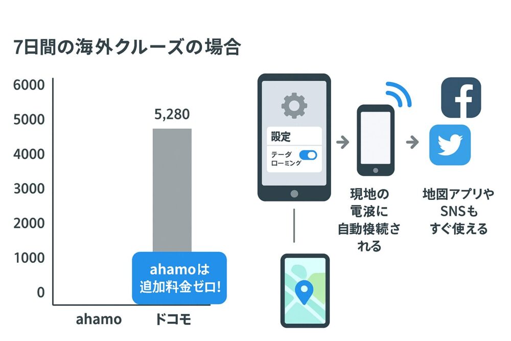 理由④:【お得】クルーズ旅行でも追加料金ゼロ!ドコモプランとの比較で一目瞭然